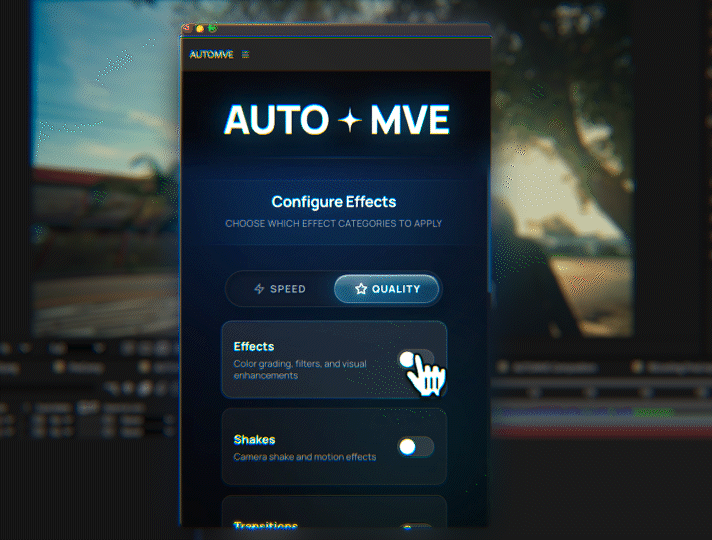 Enable or disable shakes, effects, transitions, wipes, and scene edit detection anytime. You stay in control while Auto-MVE handles the heavy lifting.